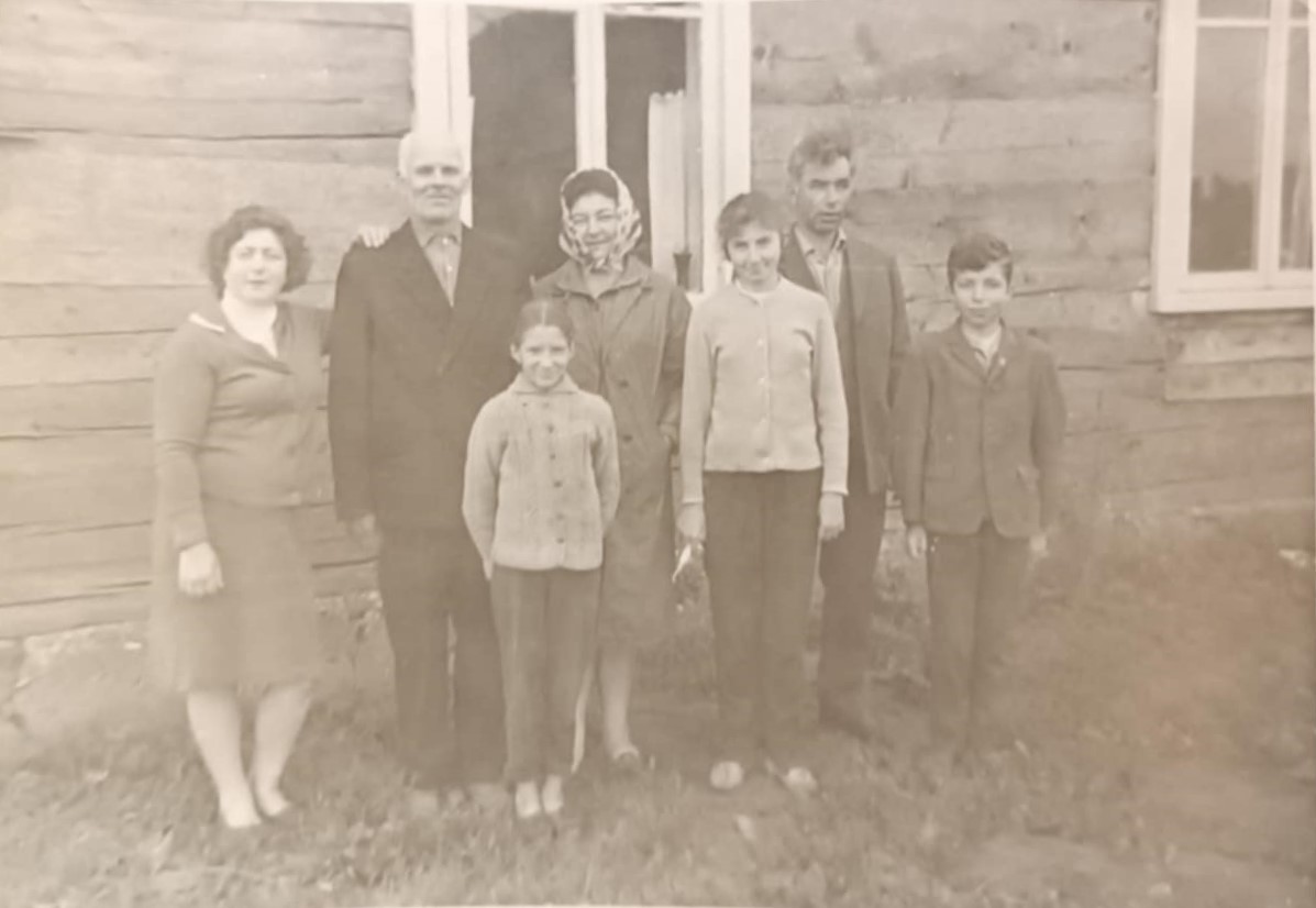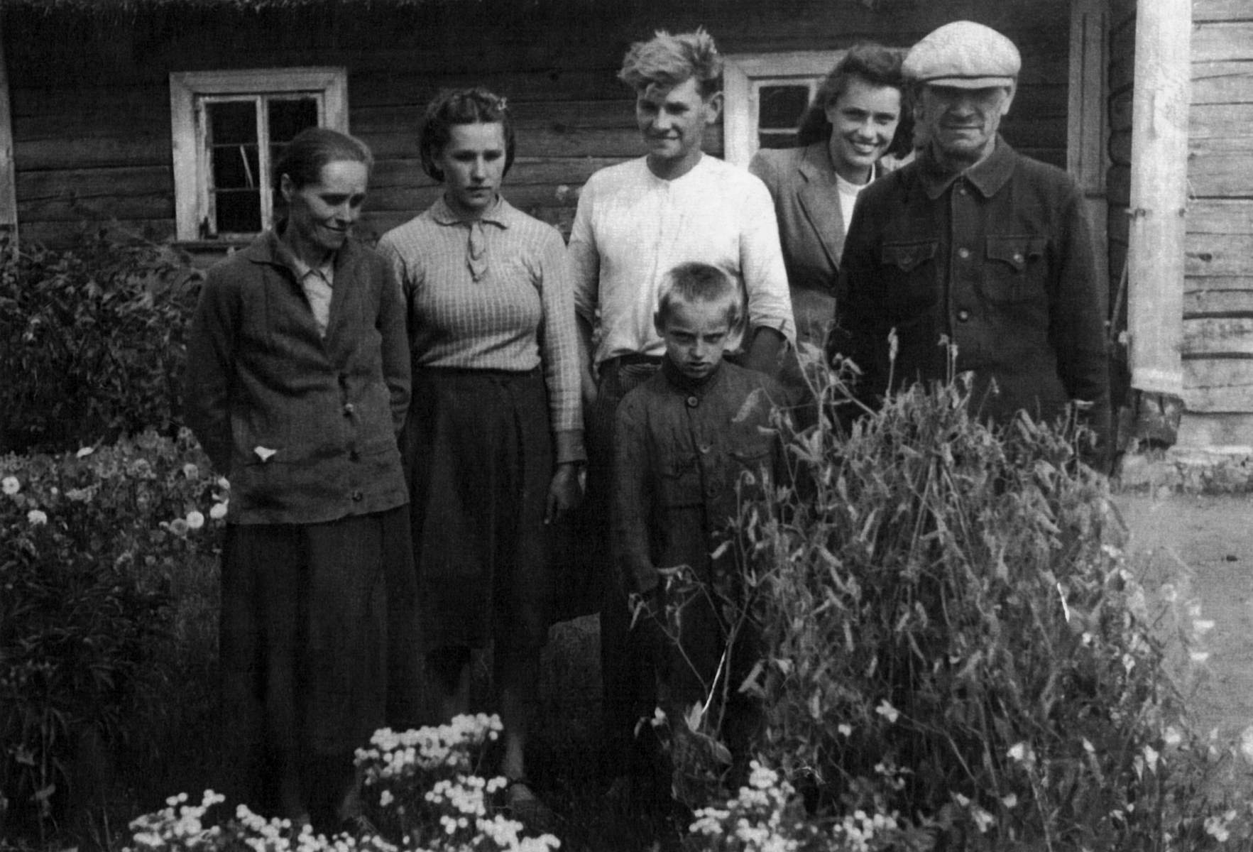 Iš kairės: Aleksas Labanauskas, Alekso ir Zofijos Labanauskų sūnus Aleksandras, Zofija Labanauskienė, Vytautas, Filomena ir Petras Labanauskai prie savo sodybos. Apie 1960 m |