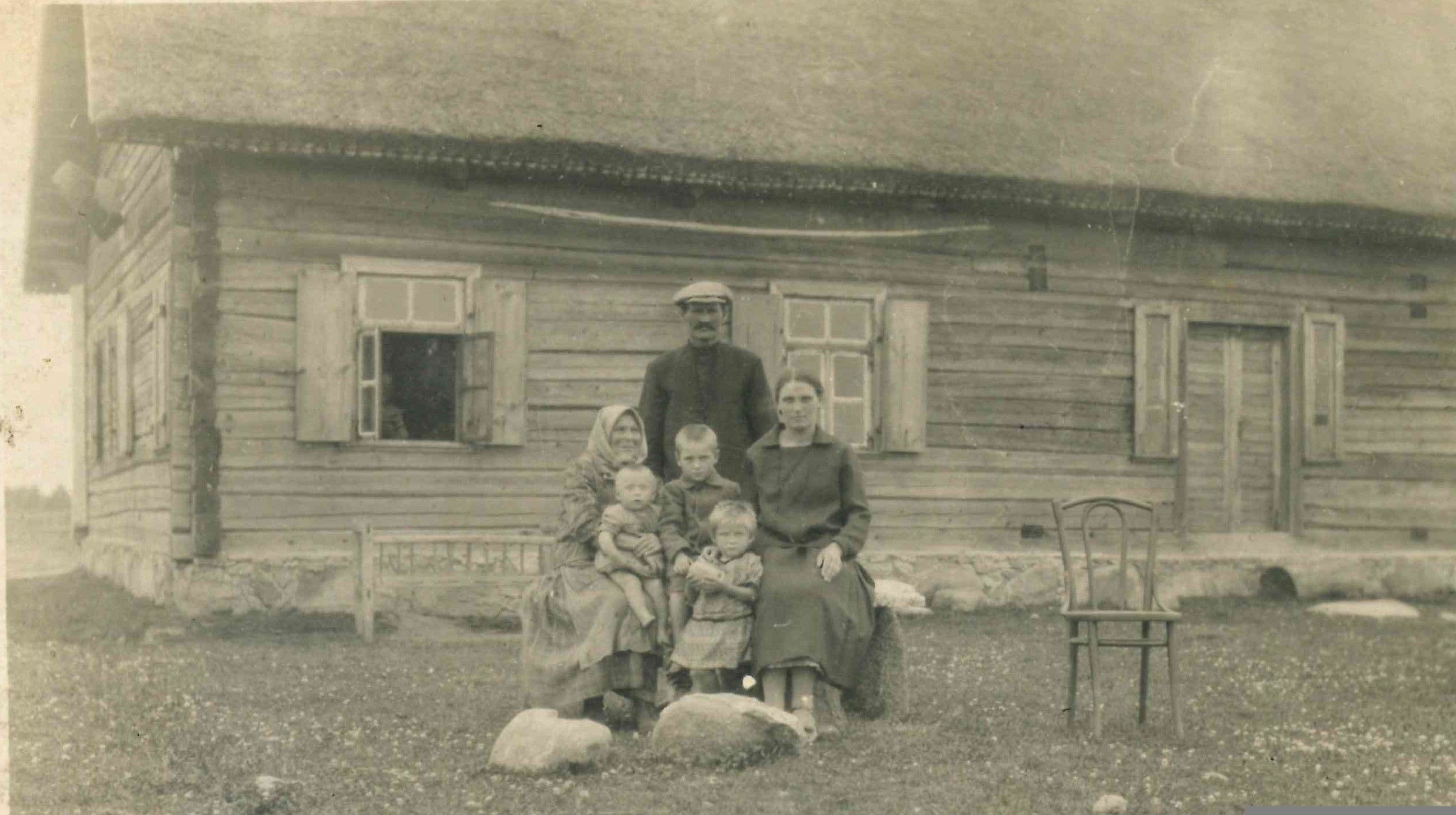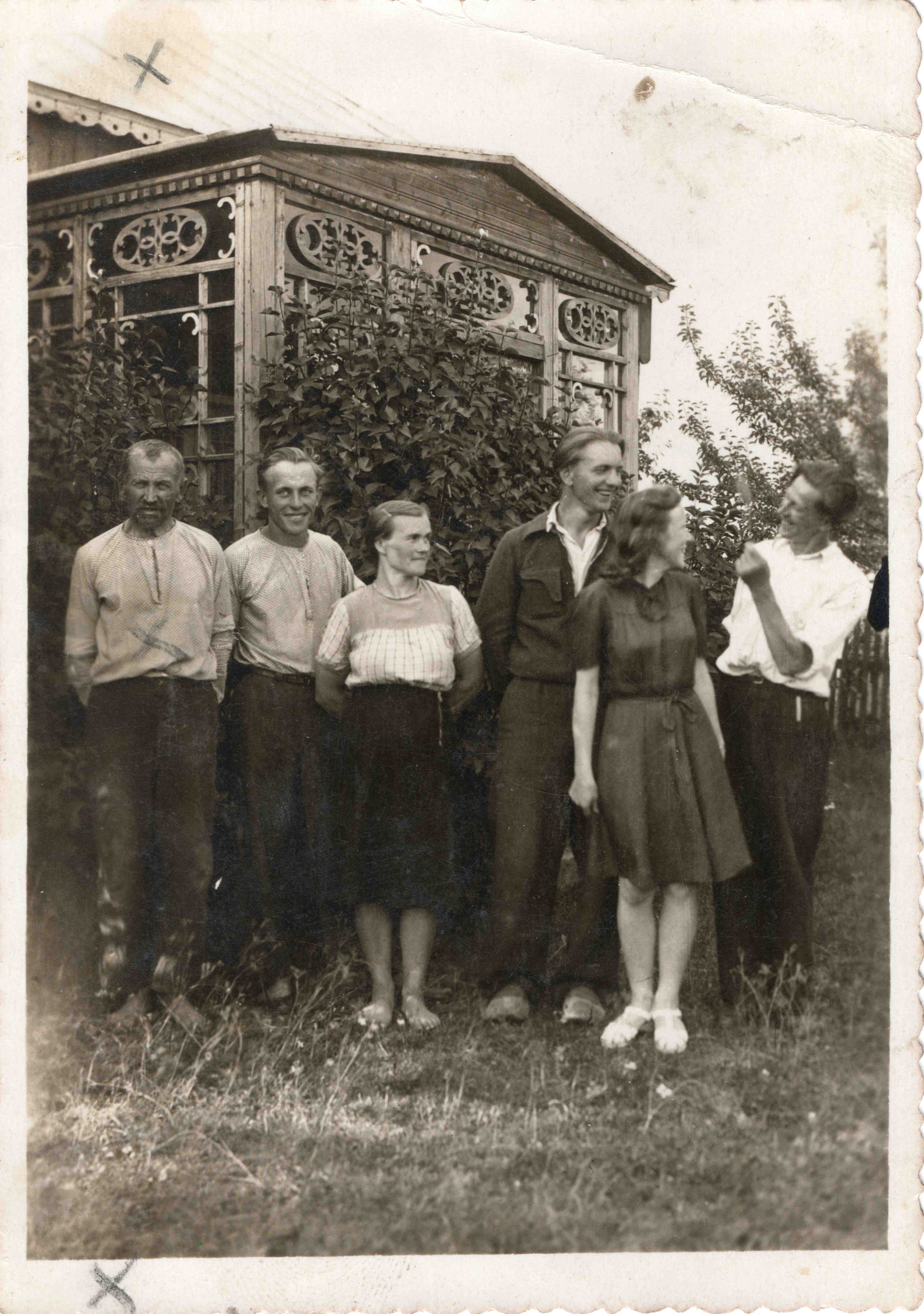 Iš kairės: Olia Brojaitė, Antanas Čijunskis, Cilė Brojaitė-Gražulienė, Olios vyras Griša. Priekyje Olios vaikai ir Zinaidos Čijunskytės-Sakalauskienės dukra Onutė prie Čijunskių namo, kur karo metais buvo slapstoma Cilė Brojaitė |