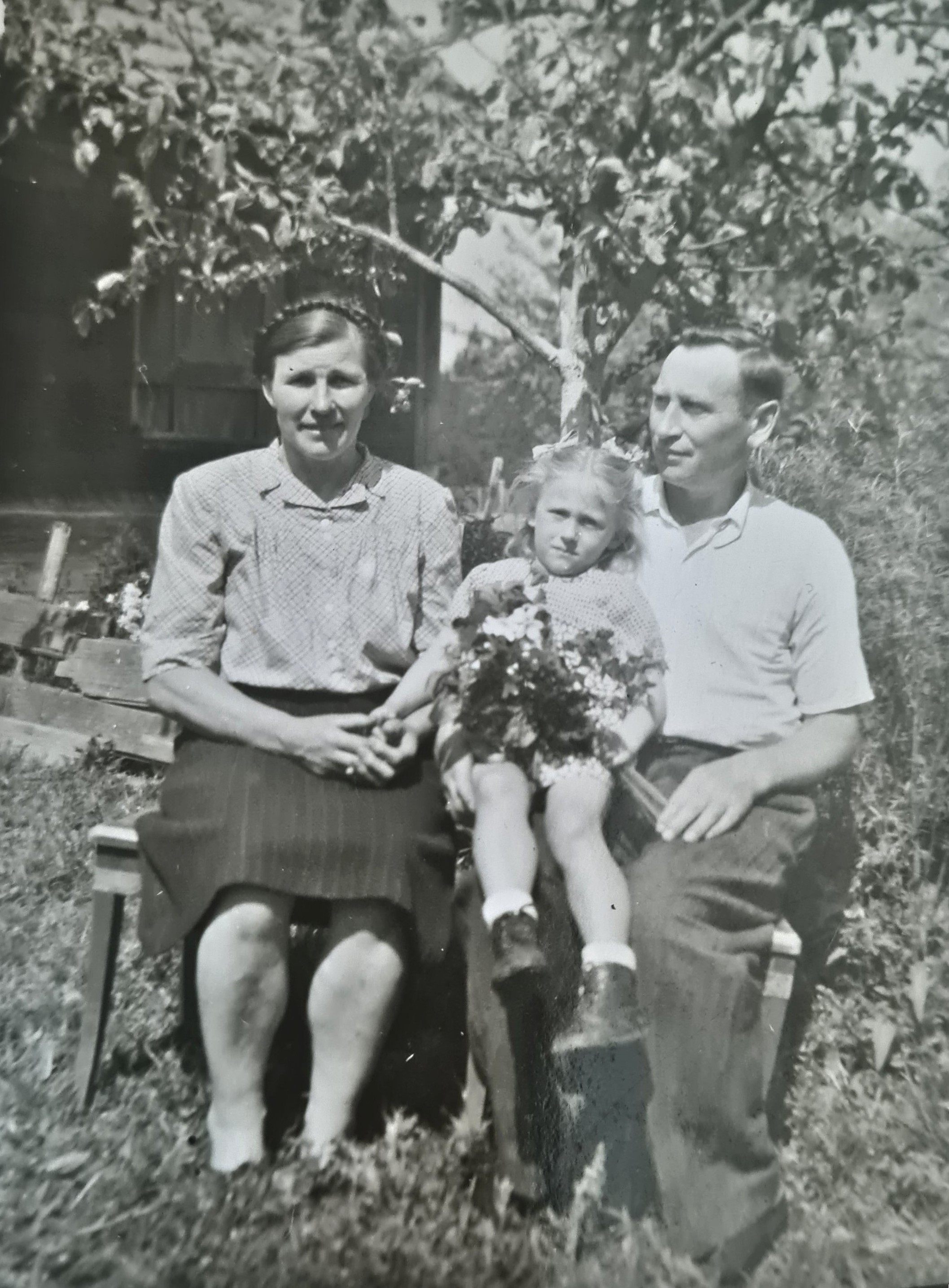 Iš kairės: Zinaida Čijunskytė-Sakalauskienė, Cilė Brojaitė-Gražulienė, Jonas Sakalauskas. Priekyje Sakalauskų dukra Onutė. Pokarinė nuotrauka |