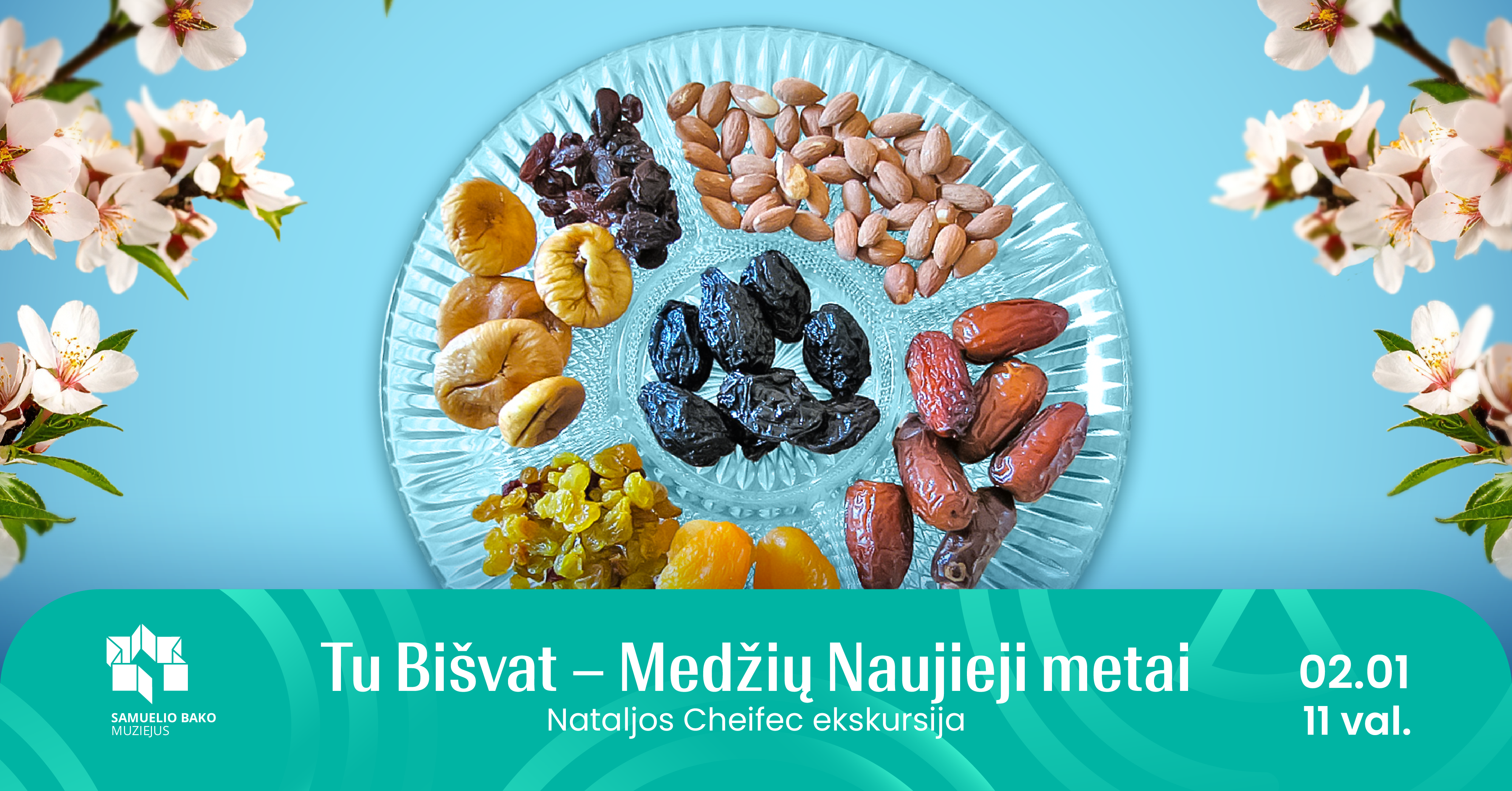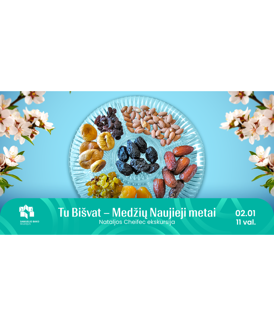 Ekskursiją ves muziejaus edukatorė Natalja Cheifec, kuri supažindins su: - Tu Bišvat prasme – Medžių Naujaisiais metais - Septyniomis žemės gėrybėmis ir jų simbolika - Medžio ir žmogaus paralelėmis: šaknimis, augimu ir vaisiais - Senomis tradicijomis, kurios stebėtinai aktualios ir šiandien