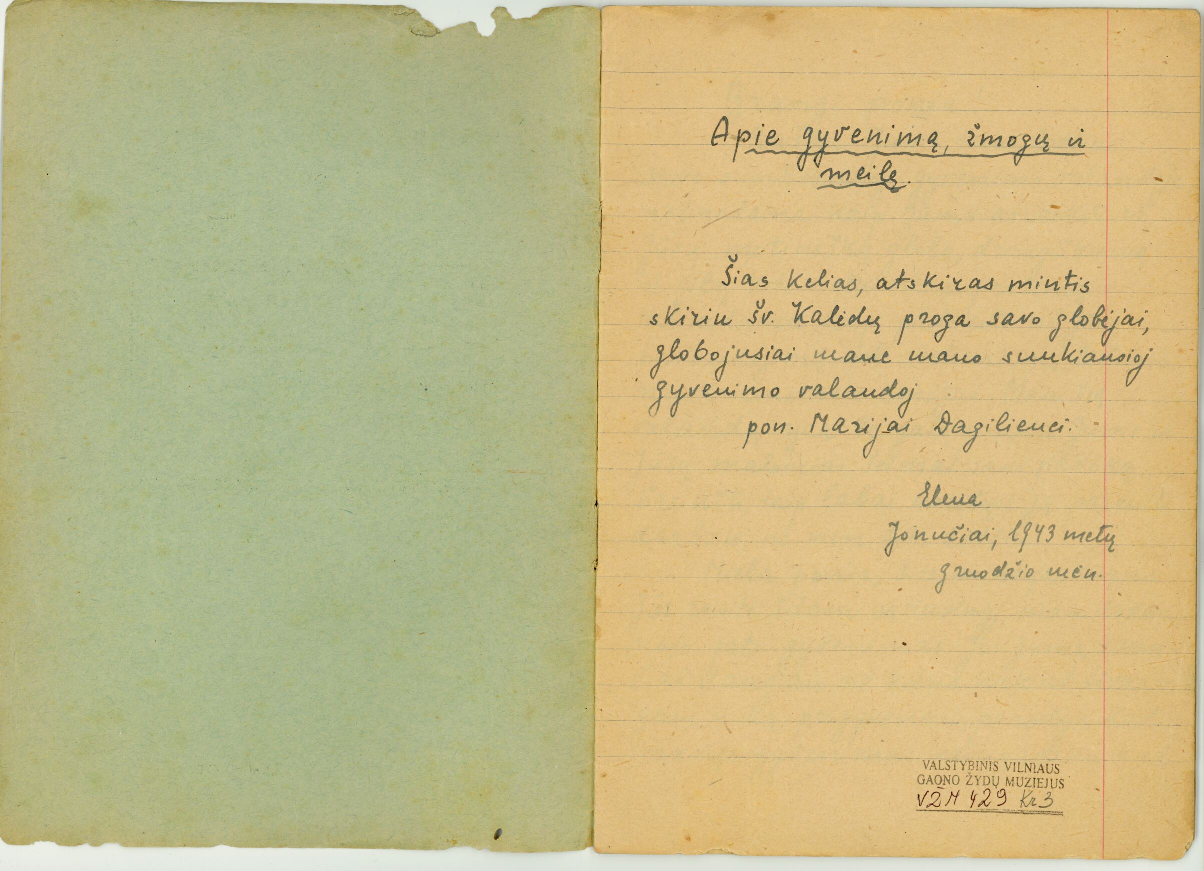 Išlikęs Elenos Bermanaitės sąsiuvinis, saugomas Vilniaus Gaono žydų istorijos muziejuje, liudija apie sudėtingas karo patirtis ir to meto įvykius. Ant sąsiuvinio viršelio ranka užrašyta: „Poniai Marijai Dagilienei. Jonučiai.“ Antraštiniame lape Elena įrašė: „Apie gyvenimą, žmogų ir meilę. Šias kelias atskiras mintis skiriu šv. Kalėdų proga savo globėjai, globojusiai mane sunkiausioje mano gyvenimo valandoje, poniai Marijai Dagilienei. Elena. Jonučiai, 1943 metų gruodžio mėn.“