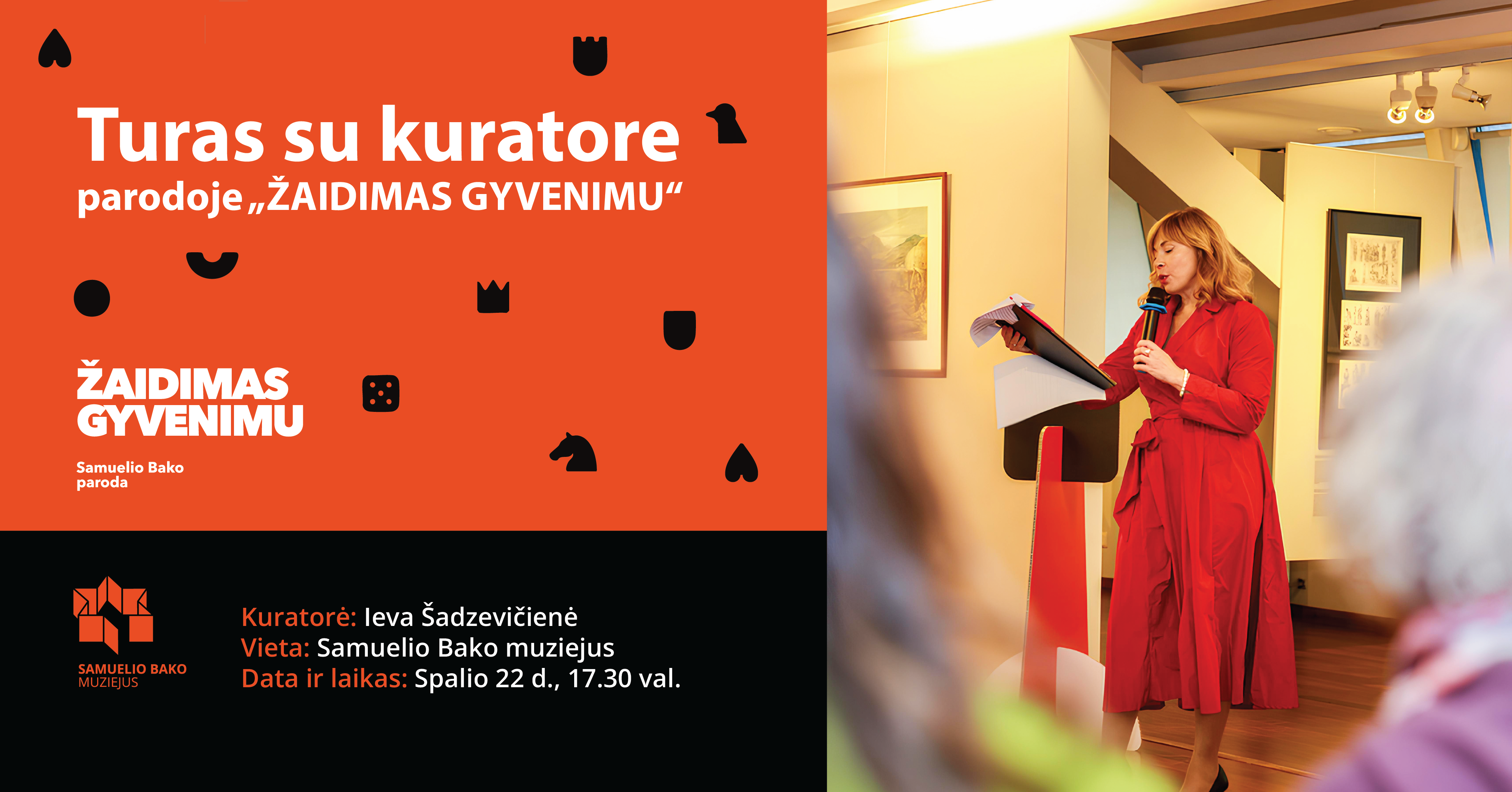 Spalio 22 d. 17.30 val. kviečiame į turą po parodą „Žaidimas gyvenimu“, kuri paremta asmenine Samuelio Bako gyvenimo istorija ir jo atsiminimais apie tėvą, „laimėjusį jam gyvenimą“. Paroda kupina gyvenimo žaidimus lydinčių simbolių: šachmatų figūrų, lošimo kauliukų, istorinių kortų.