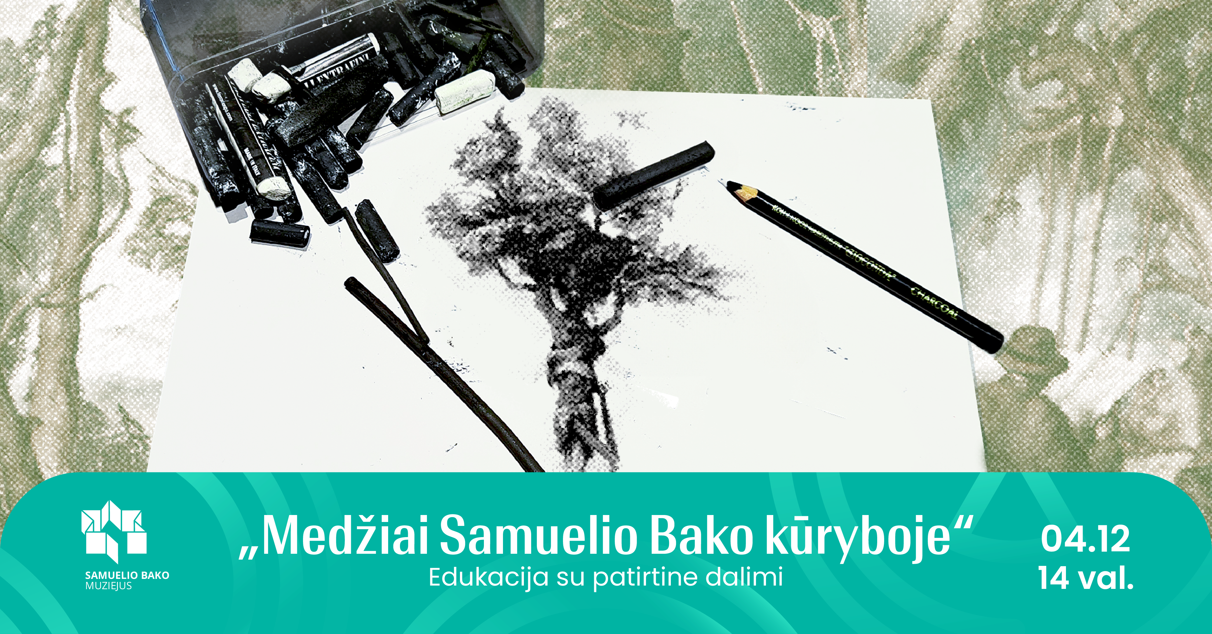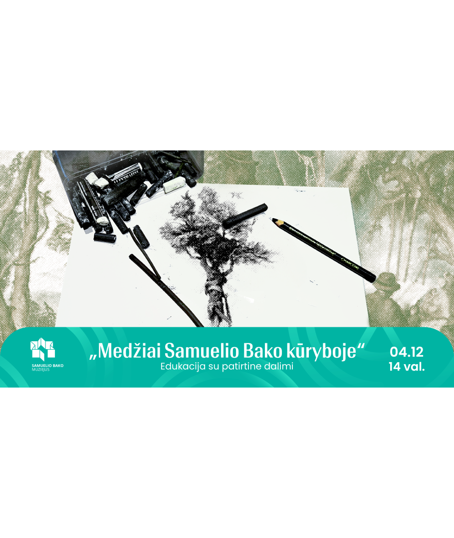 Pavasario švenčių mėnesį kviečiame atsigręžti į gamtą, mus supančią aplinką ir sudalyvauti išskirtinėje edukacijoje, kurioje dėmesys bus skiriamas medžių vaizdavimui Samuelio Bako kūriniuose. Kodėl jo paveiksluose medžiai yra pakirsti, paramstyti, augantys ant slenkančių skardžių? Vieni žmonės glaudžiasi medžių užuovėjose, kiti patys pavirsta medžių žmonėmis... Ką tai galėtų reikšti? Pasigilinę į dailininko simboliką, nersime į patirtinę dalį, kurią galima ir tiesiog stebėti. Jos metu išbandysime natūralią ir itin trapią piešimo priemonę - medžio anglį. Ši technika nuo seniausių laikų naudojama dailininkų kaip pagrindinė ir universali eskizavimo priemonė. Be abejonės, ją naudoja ir pats Samuelis Bakas realizuodamas savo kūrybines idėjas. Nesvarbu, ar esate pradedantysis mėgėjas, ar tiesiog smalsus muziejaus lankytojas leiskite sau patirti piešimą anglimi muziejaus erdvėse!