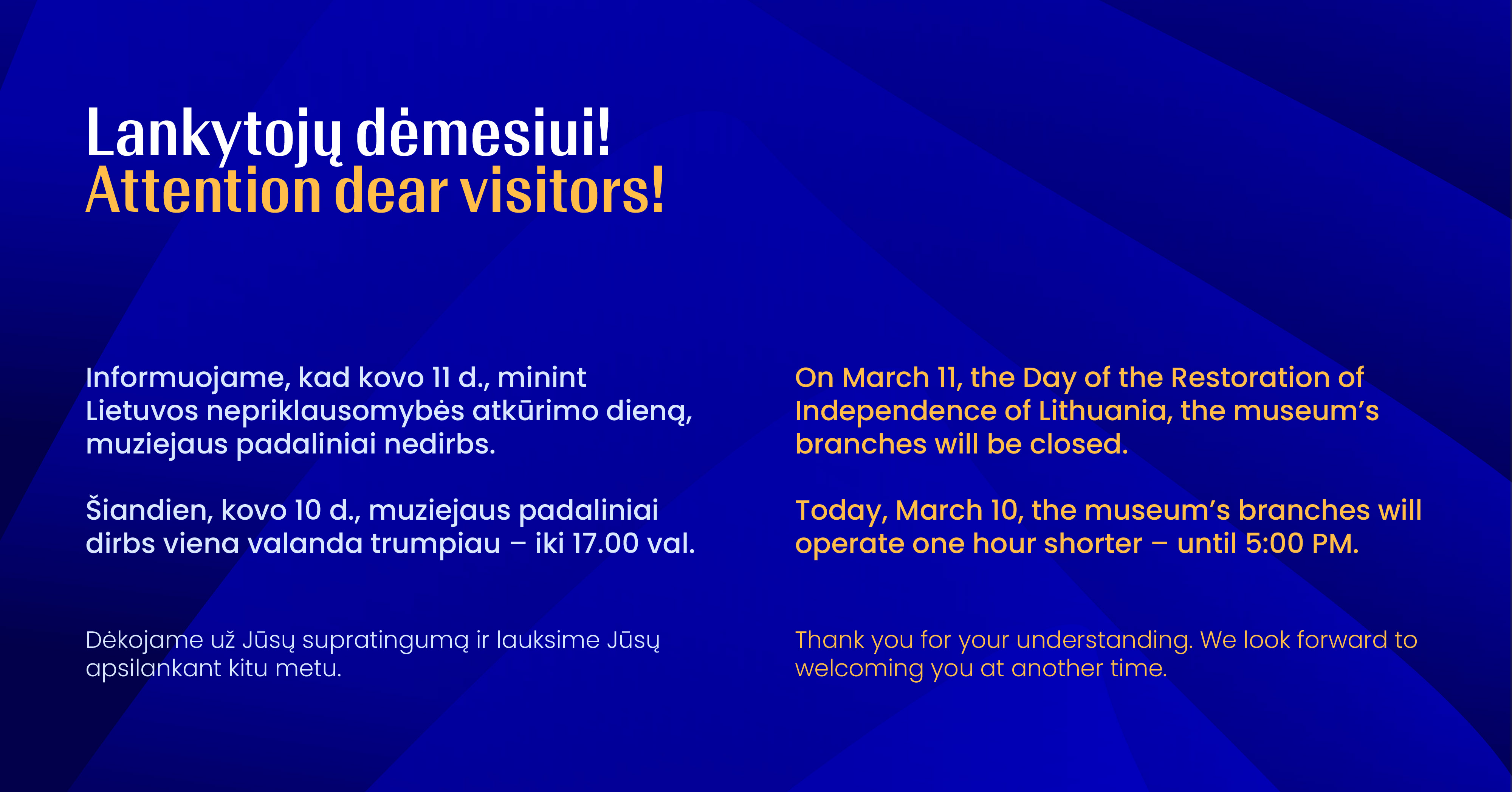 Thank you for your understanding, and we wish you a beautiful and meaningful Day of the Restoration of Independence of Lithuania!