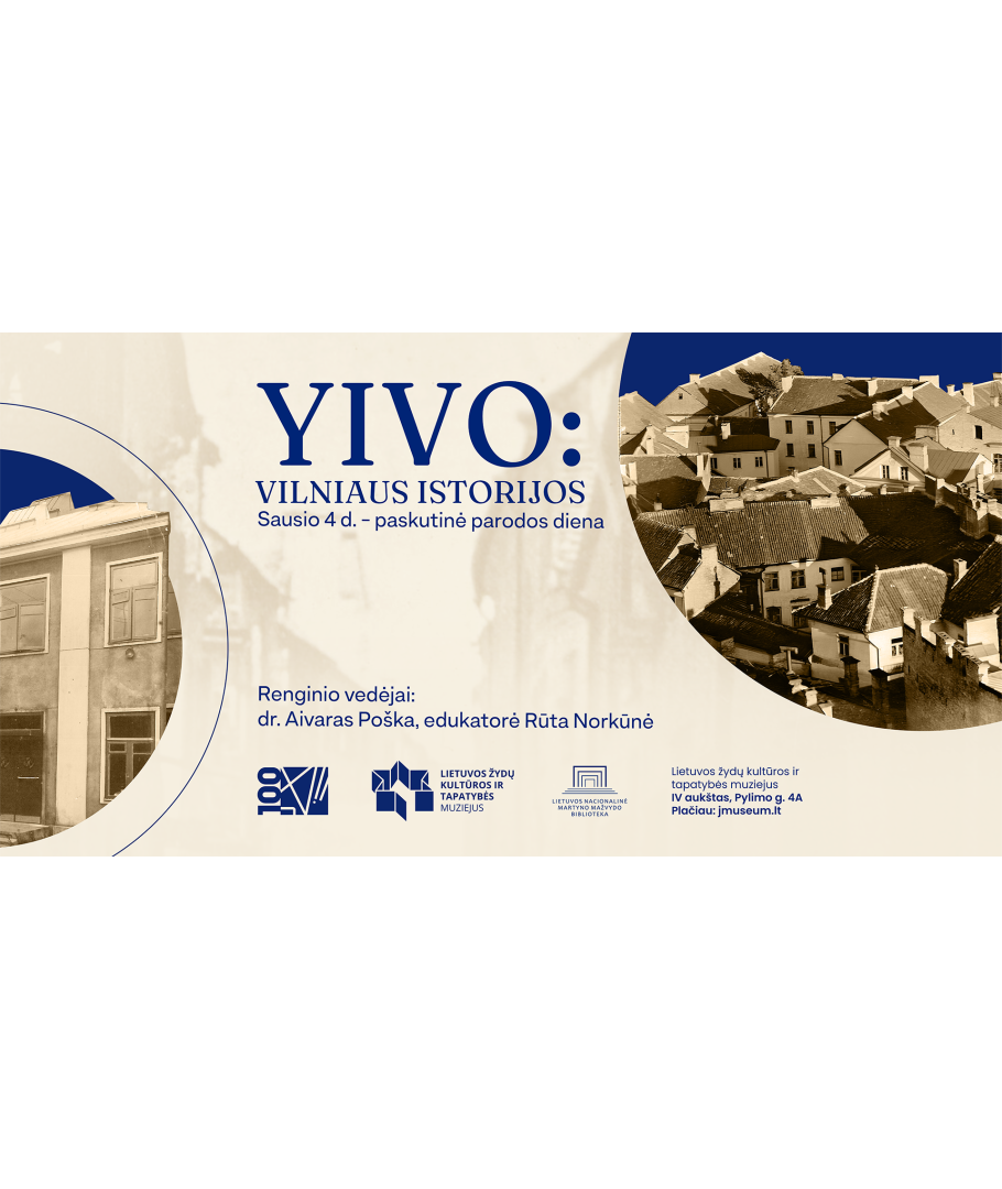Kviečiame į parodos „YIVO: Vilniaus istorijos“ uždarymo renginį - gyvą susitikimą su šiuo pasakojimu apie tarpukario Vilnių, jidiš kultūrą ir YIVO instituto gimimą mieste, kadaise vadintame Lietuvos Jeruzale. Paroda, skirta YIVO instituto įkūrimo šimtmečiui, atveria Vilnių kaip pasaulinį žydų intelektinį centrą ir leidžia pažinti žmones, idėjas, kasdienybę bei svajones, formavusias modernią žydų tapatybę.