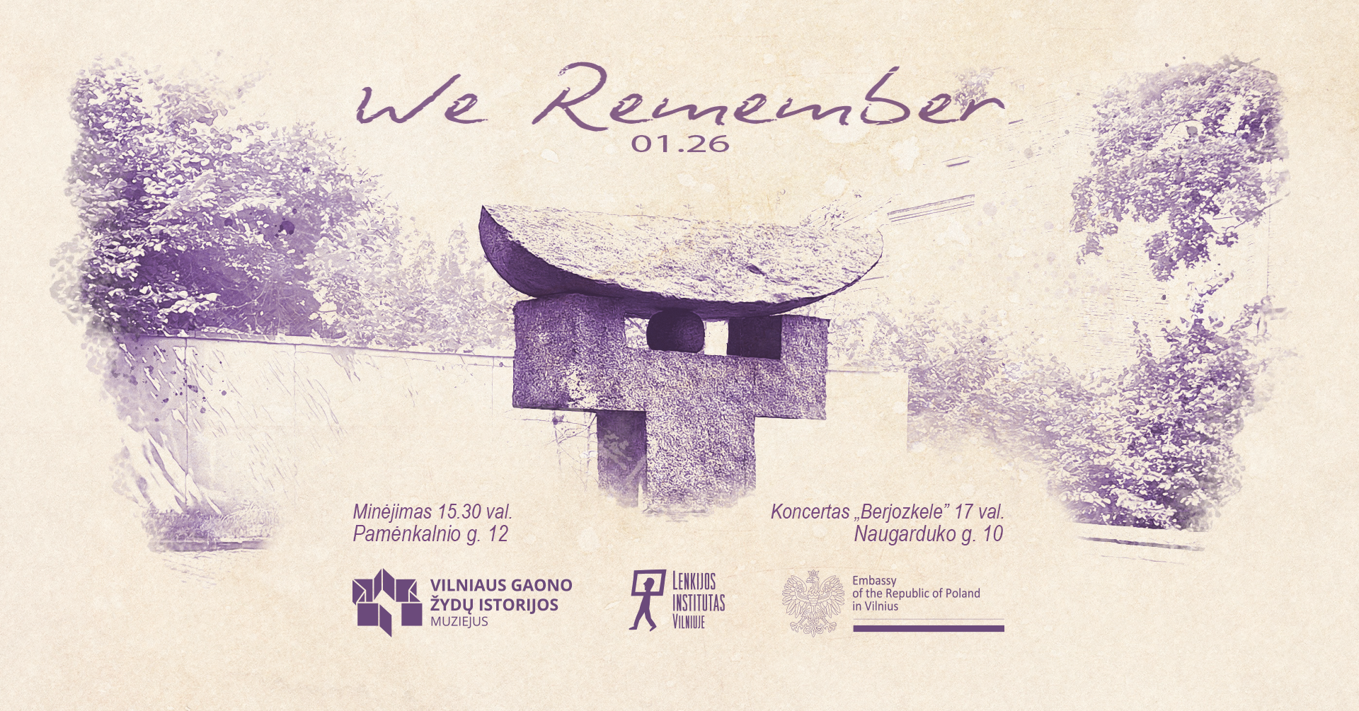 Date and time of the event: January 26th (Monday), 15:30 (commemoration at the Chiune Sugihara monument), 17:00 (concert at the Samuel Bak Museum).