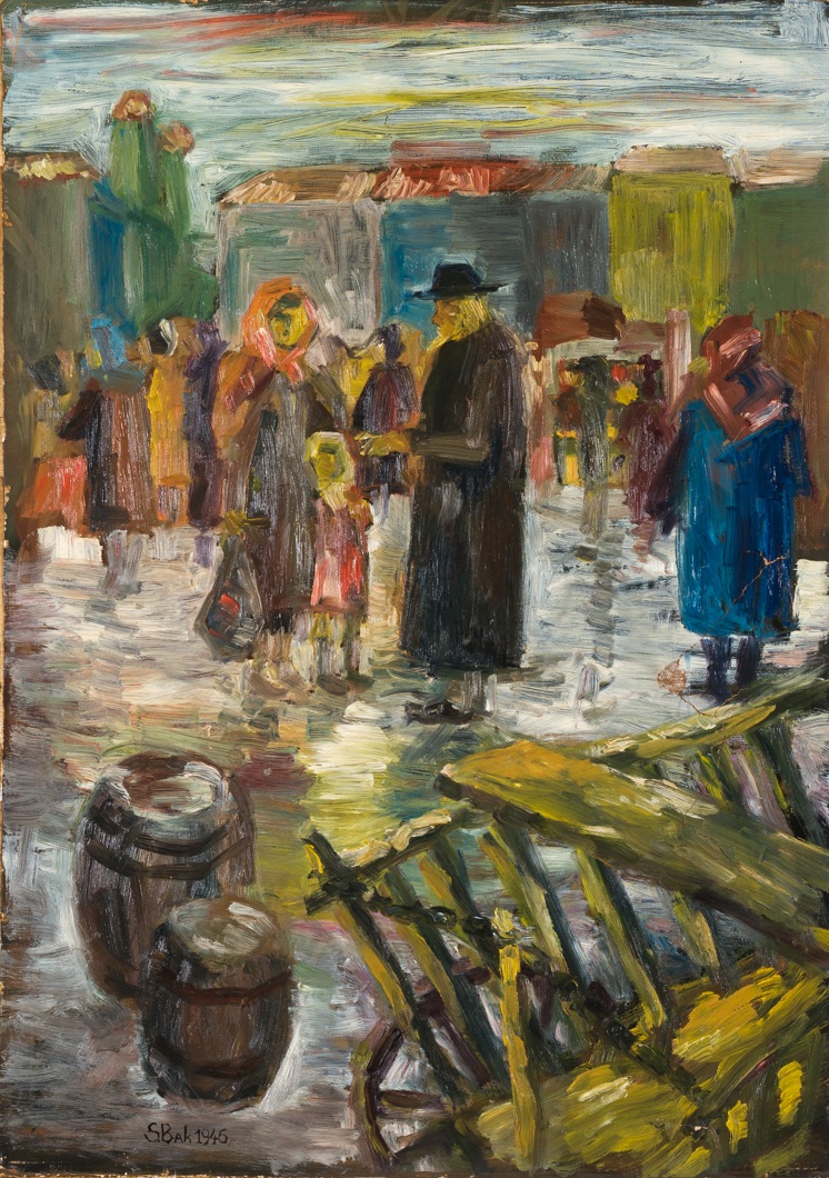 It is the first oil painting made by Bak using paint provided by US Army Major Leo Srole, who had asked his wife Esther to send it to a talented boy, who lived in the Displaced Persons camp in Landsberg, Germany. Since there was no turpentine to dilute the paint, Samuel used the paint directly from the tubes. There was no canvas available either, but he found an old torn painting of a saint with a hole in it in the rubbish dump of the camp. He tore a pocket off his pyjamas to mend the canvas. In 1948, his mother rolled this work up and took it together with all their belongings to Israel where they travelled to start a new stage in their life. The painting miraculously survived through all of Bak’s travels.