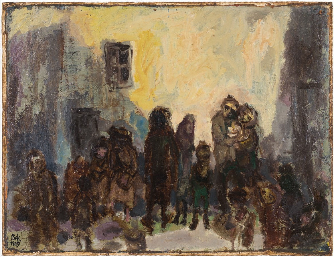 These are the paintings created in Israel, where Bak and his mother emigrated to in 1948. Bak is still haunted by reminiscences of the ghetto and these are reflected in the dark gloomy colours. The forms are becoming closer to abstract forms. These are “daily” scenes he saw in the ghetto: people dead of exhaustion lying on the pavement or families lined up in the shadows of permanent fear, awaiting their time to nothingness. These paintings are the testimony of a child who was haunted all his life by the horror experienced in the Holocaust.